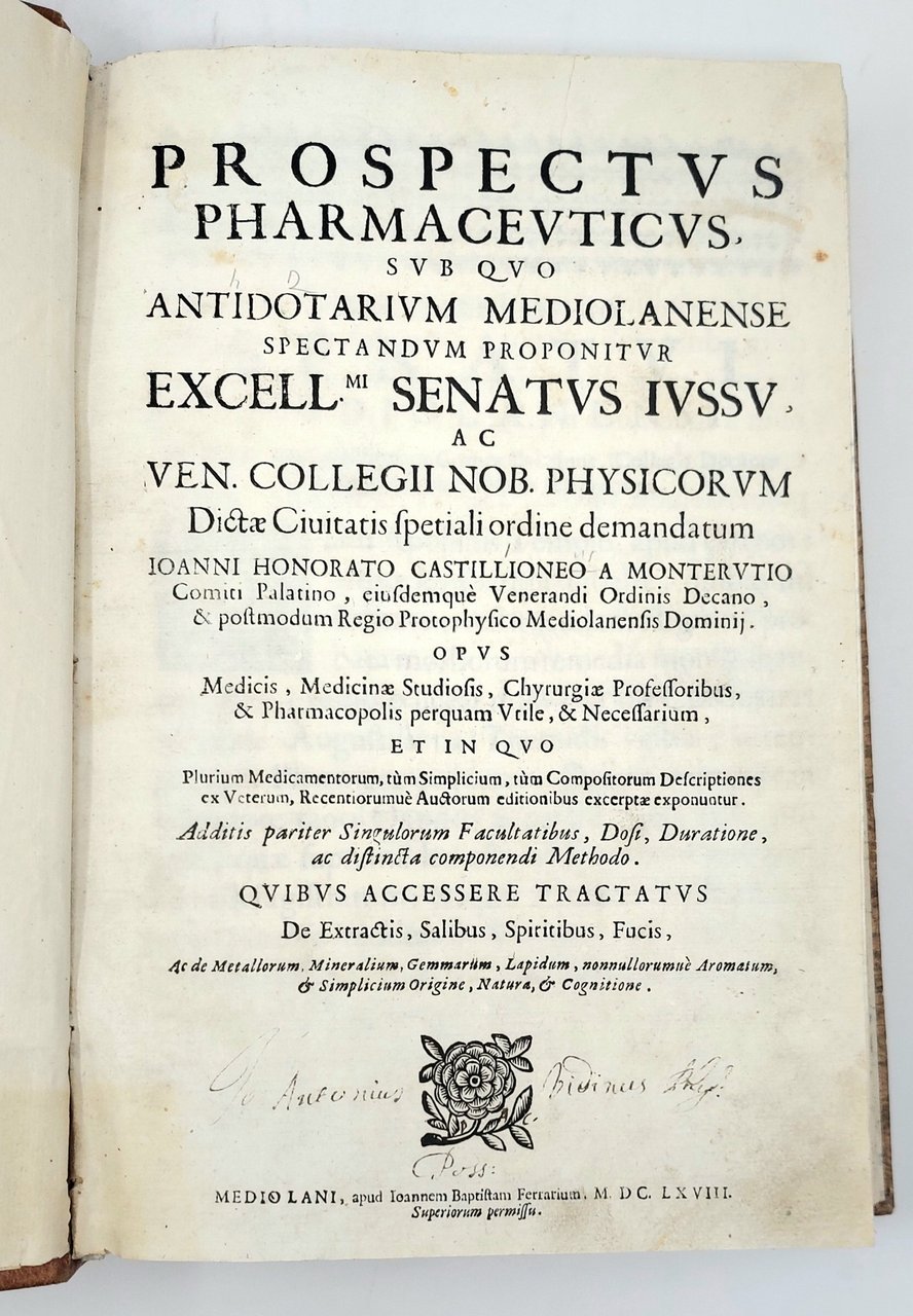 Prospectus Pharmaceuticus, sub quo Antidotarium Mediolanense... Opus medicis, medicinae studiosis, chirurgiae professoribus, & pharmacopolis perquam vtile, & necessarium ... Quibus accessere Tractatus de extractis, salibus, spiritibus, fucis, ac de metallorum, mineralium...