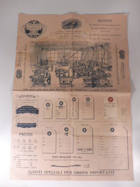 Bifoglio ripiegato (4 pagine) cm 35 x 50 circa con varie illustrazioni di campioni raffiguranti etichette. Due etichette sono inoltre presenti e applicate su carta. Alone alla prima e all'ultima pagina. Grande xilografia raffigurante operai al lavoro nello stabilimento.