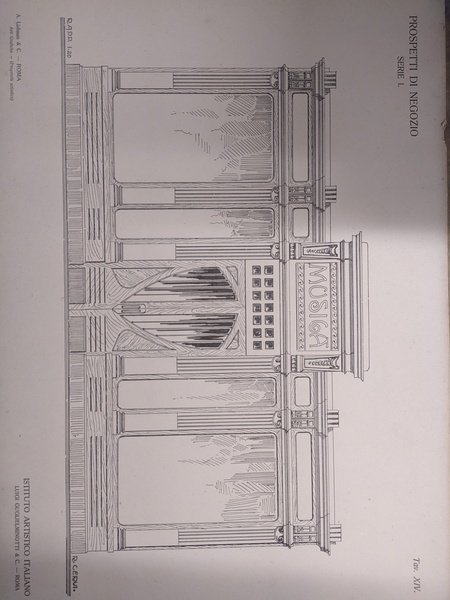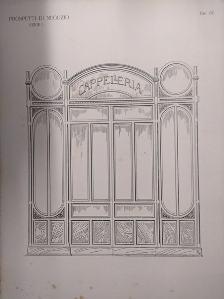 tavole xilografie su cartoncino A. Liebman & C. Roma, di cm. 33 x 49. Disponiamo: 1) BAR (Bibite, Caffè, Gelati, Liquori) orizz.; 2) AMERICAN BAR (Giorgio Binelli), orizz; 3) CONFETTERIA (vert.); 4) MODE (R. Cervi) orizz.; 5) PARRUCCHIERE (R. Villani), vert.; 6) CAFFE' (vert.); 7) BAR-CAFFE'-RISTORANTE (vert.); 8) BAR (Mostra con lampadine tra i modiglioni) vert.; 9) SALON PROFUMERIE (vert.); 10) Mode-Novità-Nastri-Trine (vert.). Ognuna