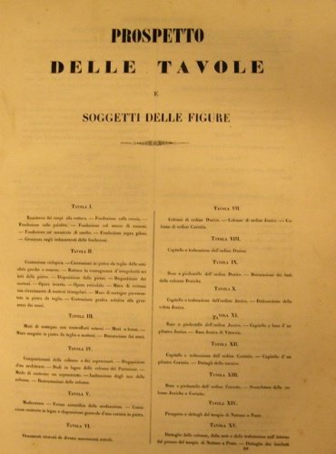 In-folio (cm 47x33) pp. 462. Legatura cartonata con chiusura con tre nastri di raso. XCIV (94) Tavole raffiguranti prospetti di monumenti, costruzioni, capitelli, decorazioni, templi, colonne, palazzi. Contiene piante del castello delle Tuillerie, finestre del Tempio di Vesta a Tivoli, piante di una facciata del Louvre sopra la corte e molte altre. Angolo superiore destro della tav. 89 riparato con scotch. Segni di usura ai piatti.