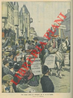 Protesta delle suffragette a Londra. (Signore a piedi e a cavallo con manifesti).