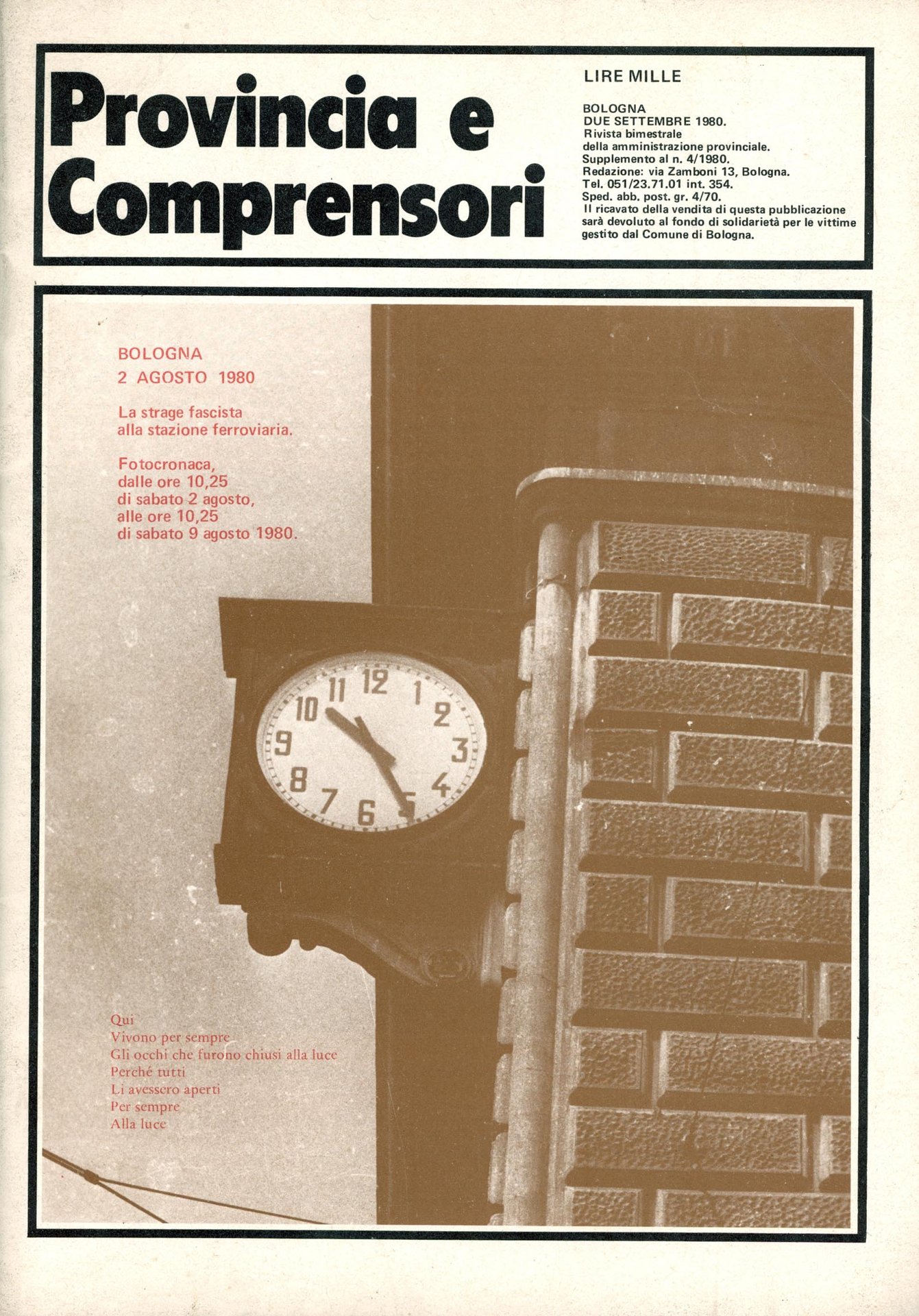 Notiziario della Provincia di Bologna. Settembre 1980. La strage alla stazione ferroviaria di Bologna. Illustrazioni in nero n.t. 050 LOC – Ba In Quarti ( 24-30cm ) Ottimo (Fine) Ottimo