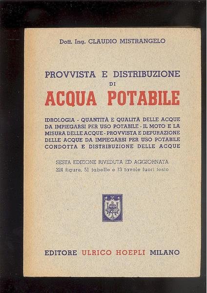 IN 8 ( cm.25,5 X 18 ), pp.XX, 492 +TAVOLE XIII in b/n,+ v.r. f.t.324 FIGURE, 51 TABELLE. COPERTINA EDITORIALE IN BROSSURA CON TITOLO. L'OPERA CONTIENE : IDROLOGIA - QUANTITA' E QUALITA' DELLE ACQUE DA IMPIEGARSI PER USO POTABILE - IL MOTO E LA MISURA DELLE ACQUE - PROVVISTA E DEPURAZIONE DELLE ACQUE DA IMPIEGARSI PER USO POTABILE - CONDOTTA E DISTRIBUZIONE DELLE ACQUE. SESTA EDIZIONE RIVEDUTA E AGGIORNATA. OTTIMA CONSERVAZIONE, INTONSO.ID 4383