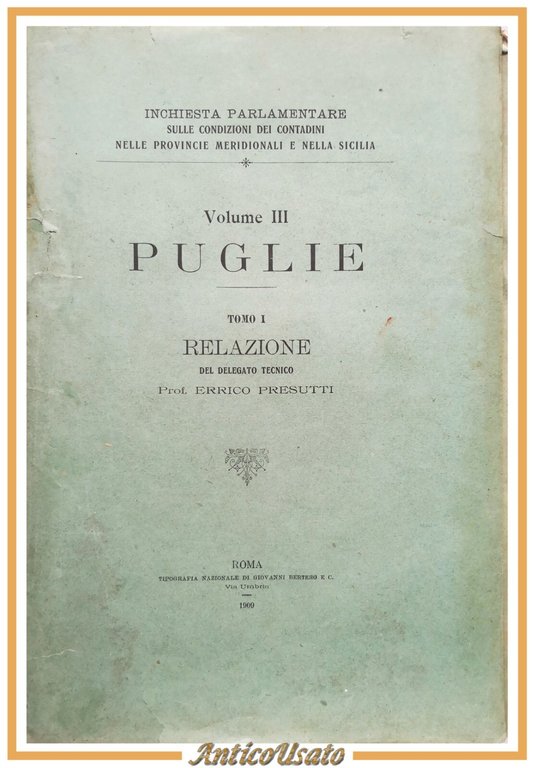 PUGLIE. Relazione del delegato tecnico Errico Presutti. Inchiesta parlamentare sulle condizioni dei contadini nelle provincie meridionali e nella Sicilia. Volume III, tomo I e II.