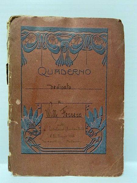 Quaderno in 8°, br., dove sono incollati numerosi articoli di giornale che parlano del bambino prodigio Willy Ferrero (1906), già famosissimo Direttore d'Orchestra a soli 7 anni. Il quaderno contiene anche una cartolina autografa di Willy Ferrero ed una lettera autografa (incollata) del padre. Copertina staccata, lievi mende a d. e copp.