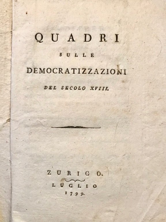 In-8° (cm. 19), legatura coeva in cartoncino alla rustica, pp.96 in buono stato e in barbe. Edizione originale di un opuscolo anonimo e controrivoluzionario che analizza il tentativo francese di esportare democrazia con la Rivoluzione, più che in dottrina in fatti (declino economico, spopolamento, fucilazioni, degrado, etc.). Cfr. Soranzo 534; Viallon-Boullier 501. Ottimo esemplare. (SN5)