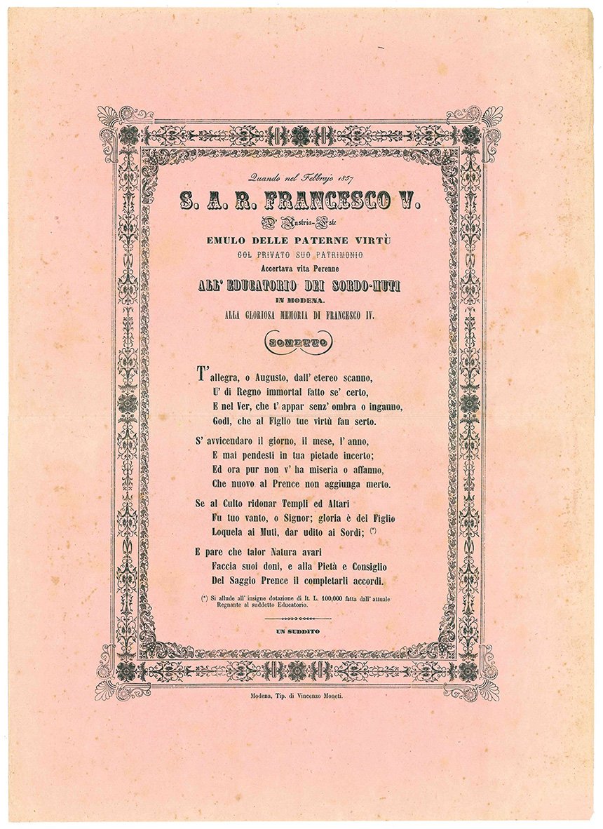 Quando nel Febbraio 1857 S.A.R. Francesco V d'Austria-Este emulo delle paterne virtù col privato suo patrimonio accertava vita perenne all'Educatorio dei sordo-muti in Modena alla gloriosa memoria di Francesco IV. Sonetto.