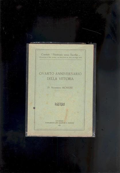 IN 16°, c.4, COPERTINA EDITORIALE IN BROSSURA VERDE CON TITOLO ENTRO CORNICE.<BR>COMMEMORAZIONE DEL IV ANNIVERSARIO DELLA VITTORIA, A CURA DEL COMITATO<BR>" FILANTROPIA SENZA SACRIFICI ", DEDICATO ALLE GIOVANI SPERANZE DELLA PATRIA PERCHE' SULL'ESEMPIO DI CHI OFFRI' AD ESSA OLOCAUSTO DI SE' IMPARINO AD AMARLA A DIFENDERLA. INTERESSANTE EDIZIONE STAMPATA SU CARTA BIANCA E ROSSA ( OLTRE<BR>ALLA COPERTINA VERDE ) CHE INNEGGIA AL TRICOLORE. OTTIMA CONSERVAZIONE.ID 3536