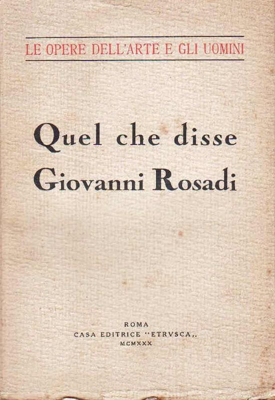 In-8°, legatura editoriale in brossura con titoliin rosso e nero,pp. V(1)-451(1). Testi sul gusto musicale, le demolizioni nel centro di Firenze (1898), la Loggia dei Mercanti di Pistoia, il Duomo di Arezzo, Casa Verdi a Milano, Antonio Canova, Il Barbiere di Siviglia, la ripristinata Villa Guinigi a Lucca, Palestrina, Paisiello, Leonardo, Segantini, Boito, Poggi, Romanelli, Boccherini, Puccini, e molti altri ancora. Giovanni ROSADI (Lucca, 1862 - Firenze, 1925) è stato politico, avvocato e letterato italiano. Precursore dell'ambientalismo, fu l'artefice - insieme a Benedetto Croce - della prima legge sulla protezione del paesaggio in Italia (n.748 del 1922). Gli viene attribuita, tra molte altre opere, la stesura del poema goliardico Processo di Sculacciabuchi. Ottimo esemplare.