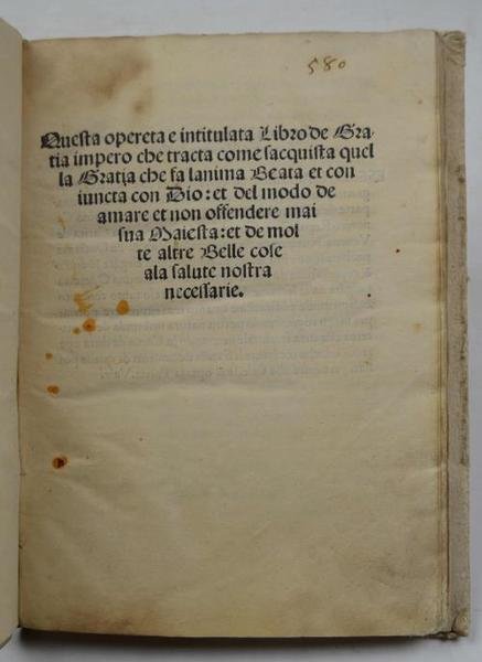 Questa opereta e intitulata Libro de Gratia impero che tracta come sacquista quella gratia che fa lanima Beata et coniuncta con Dio: et del modo de amare et non offendere mai sua Maiesta: et de molte altre Belle cose ala salute nostra necessarie.