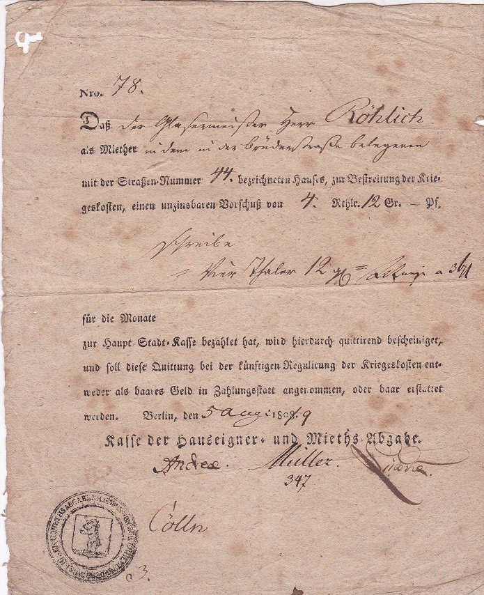 Das historische Dokument bestätigte einem Mieter in Cölln (heute Berlin-Mitte) die Zahlung einer Abgabe "zur Bestreitung der Kriegeskosten" im Jahre 1809. In das Formular wurden zahlreiche Details handschriftlich eingetragen. So wurden im oberen Bereich wohl Beruf und Name des Mieters genannt, darunter die Straße und Hausnummer. In diesem Fall scheint der Mieter wohl in der Brüderstraße 44 (nahe dem Schloßplatz) gewohnt zu haben und hat hier scheinbar eine Kriegsabgabe von 4 Reichstalern und 2 Groschen gezahlt. Die Beträge wurden numerisch und in Worten aufgeführt. Vermutlich galt die Abgabe den Kriegskosten Preußens aus den damaligen Koalitionskriegen gegen Frankreich. Der Vorschuss wurde ganz unten von den Hauseignern mit Unterschrift, Stempel, Ortsangabe und Datierung bestätigt. Sehr interessante Archivalie aus der Berliner Mitte am Anfang des 19. Jahrhunderts! ################## LIEBE KUNDEN, WIR MACHEN UNSERE JÄHRLICHE FRÜHLINGSAKTION MIT 30% RABATT AUF DEN GESAMTEN BESTAND. DIE ERMÄSSIGUNG GILT AB SOFORT, DER RABATT WIRD NACH IHRER BESTELLUNG VON DEN PREISEN ABGEZOGEN UND SIE ERHALTEN DEN ENDBETRAG VON UNS. ÜBER IHR INTERESSE AN UNSEREN SELTENEN STÜCKEN WÜRDEN WIR UNS WIE JEDES JAHR SEHR FREUEN ###################