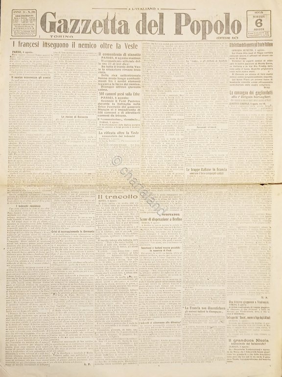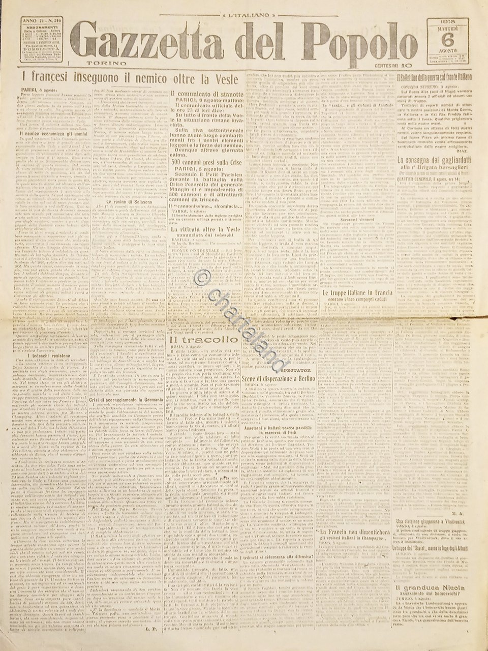 Quotidiano - Gazzetta del Popolo N. 216 - 1918 I Francesi inseguono il nemico oltre la Vesle Testo in lingua italiana. Pagine 4 con illustrazioni. Copertina morbida. Condizioni discrete/buone con segni del tempo come da foto.