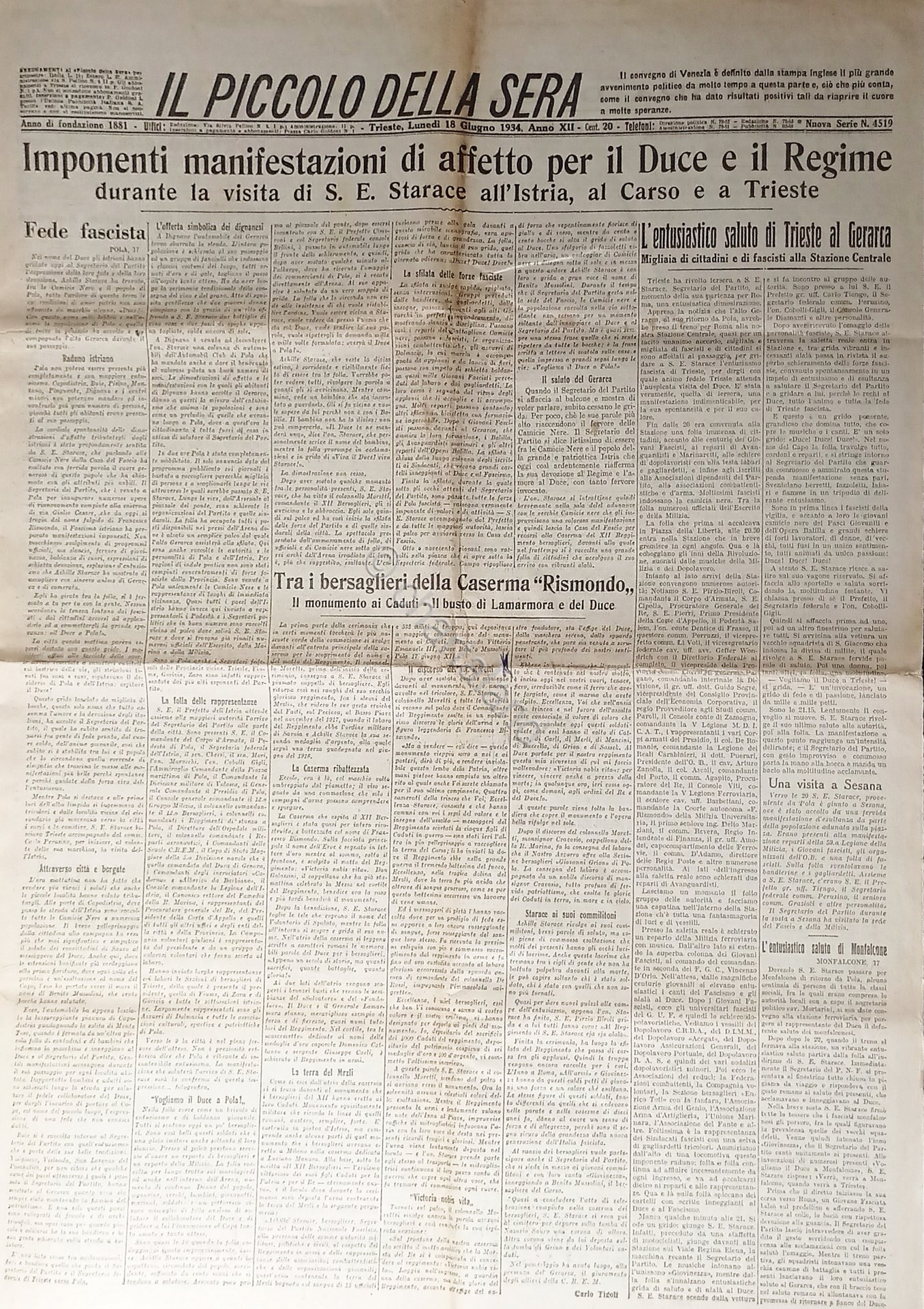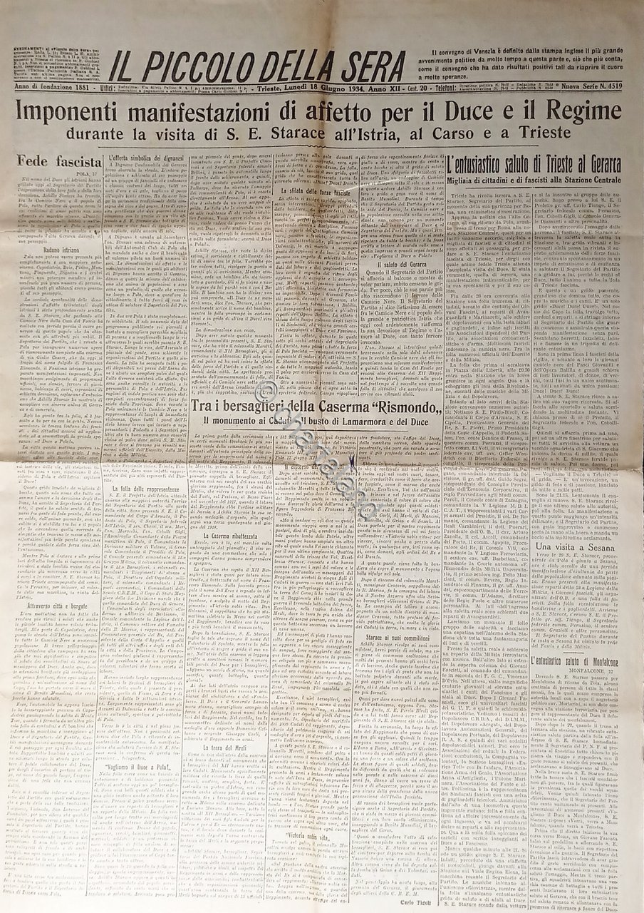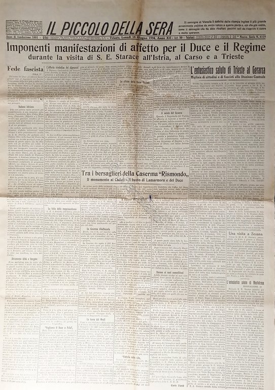 Quotidiano - Il Piccolo della Sera N. 4519 - 1934 Imponenti Manifestazioni di affetto per il Duce e il Regime Testo in lingua italiana. Pagine 6 Condizioni buone con segni del tempo come da foto.