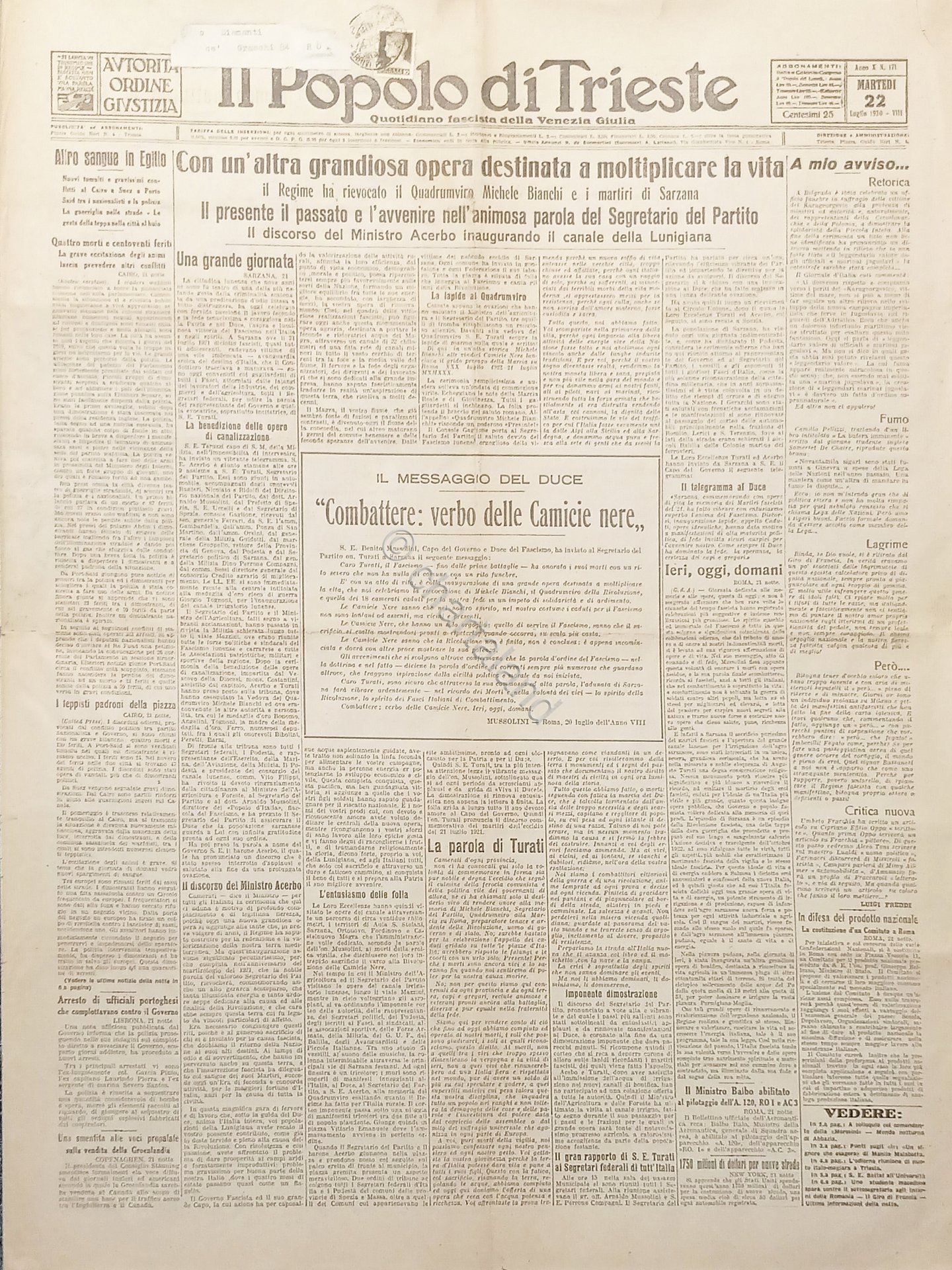 Quotidiano Fascista della Venezia Giulia - Il Popolo di Trieste N. 171 - Regime ha rievocato M. Bianchi - 1930 Testo in lingua italiana. Pagine 6 Condizioni buone come da foto.