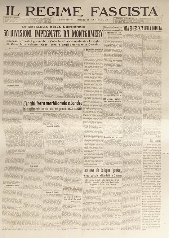 Quotidiano - Il Regime Fascista n. 145 - 1944 Divisioni impegnate da Montgomery Testo in lingua italiana. Pagine 2 Copertina morbida. Condizioni buone con segni del tempo come da foto.