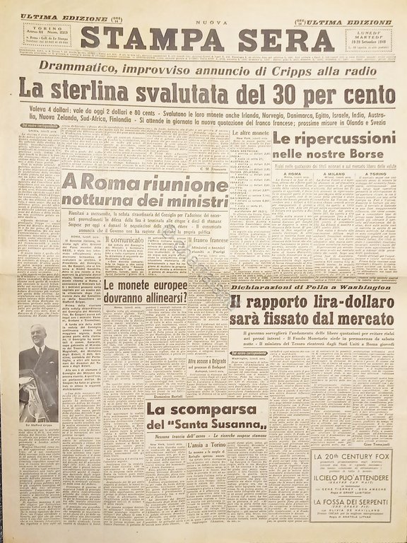 Quotidiano Torino - La Stampa Sera N. 223 - 1949 Drammatico annuncio di Cripps - svalutazione sterlina del 30% Testo in lingua italiana. Pagine 4 Copertina morbida. Condizioni discrete/buone con segni del tempo come da foto.