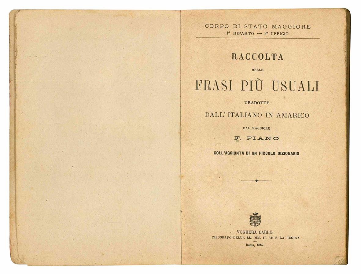 Raccolta delle frasi più usuali tradotte dall'italiano in amarico dal maggiore F. Piano con l'aggiunta di un piccolo dizionario.
