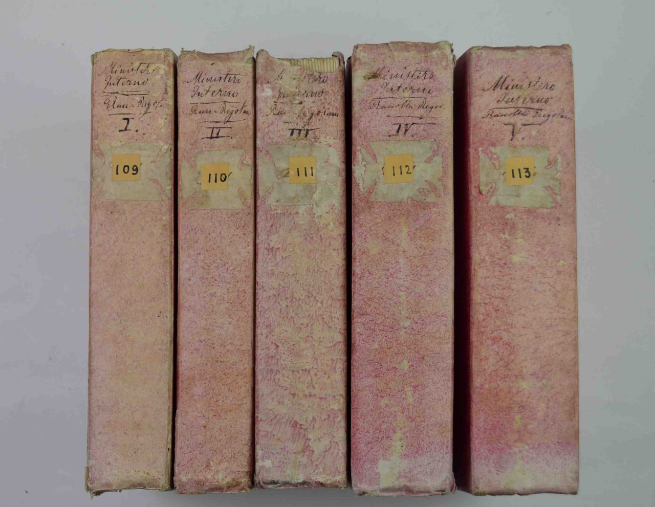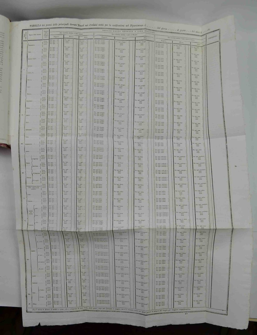 Cinque volumi di cm. 24, pp. (4) 394; 347 (1); 397; 432; 456. Con una grande tabella ripiegata al quinto volume (tabella dei prezzi delle principali derrate fattesi nei comuni scelti…). Legatura originale in cartonato rigido colorato con titoli manoscritti ai dorsi. Esemplare fresco e genuino, particolarmente marginoso, in barbe e con testimoni. A fogli chiusi e stampato su carta forte. Amplissima fonte documentaria. Rara a trovarsi completa delle cinque parti che rappresentano tutto il pubblicato.