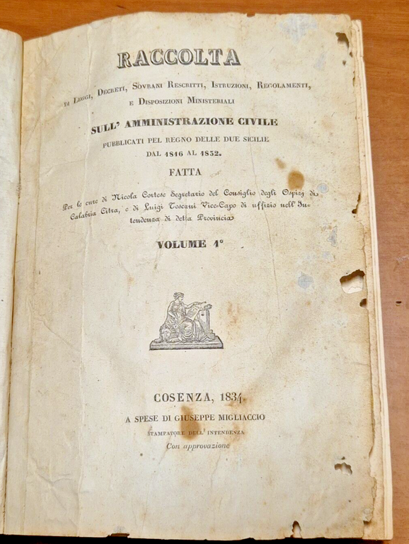 RACCOLTA DI LEGGI, DECRETI, SOVRANI RESCRITTI, ISTRUZIONI, REGOLAMENTI E DISPOSIZIONI MINISTERIALI sull'amministrazione civile pubblicati per Regno delle Due Sicilie dal 1816 al 1832 (I volume) a tutto il 1835 (volume II) a tutto il 1839 (volume III) fatta per le cure di Nicola Cortese segretario del consiglIo degli ospizii di Calabria Citra e di Luigi Toscani vice capo di ufficio dell'intendenza di detta provincia. OPERA COMPLETA IN 3 VOLUMI RILEGATI IN UNO.