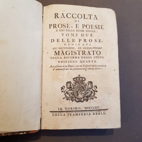 RACCOLTA DI PROSE, E POESIE A USO DELLE REGIE SCUOLE. TOMI DUE DELLE PROSE. EDIZIONE QUARTA. ACCRESCIUTA D'UN TOMO, CON UN DISCORSO DELLA MANIERA D'AMMAESTRARE LA GIOVENTU NELLE UMANE LETTERE