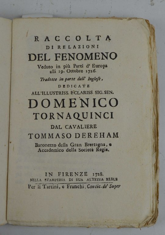 Raccolta di relazioni del fenomeno Veduto in più Parti d'Europa alli 19. Ottobre 1726. Tradotte in parte dall'Inglese…