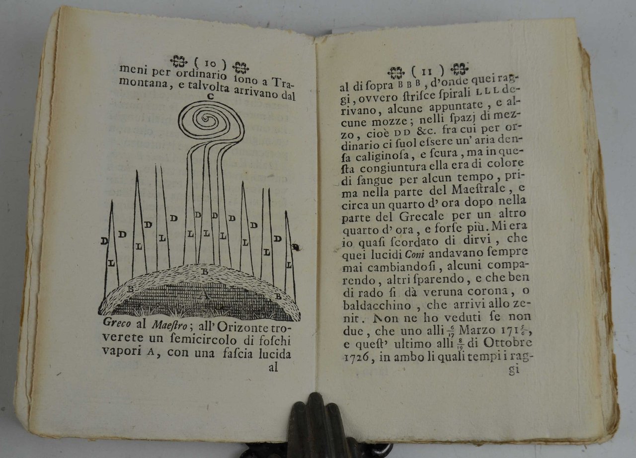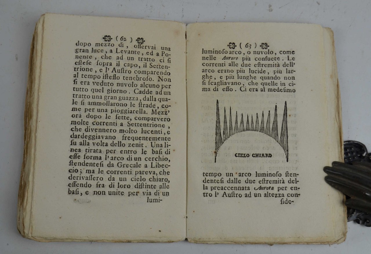 Cm. 18, pp. 101 (3). Con due figure incise nel testo. Leg. strettamente coeva in cart. alla rustica. Esemplare genuino, marginoso ed in ottimo stato di conservazione. Edizione unica e non comune della traduzione italiana di questo interessante trattato sui fenomeni conosciuti sotto il nome di Aurora Boreale.