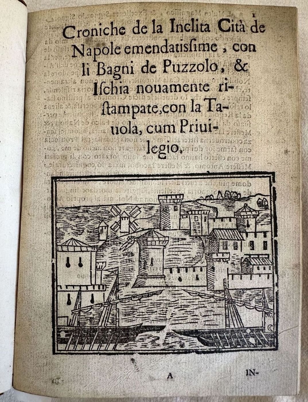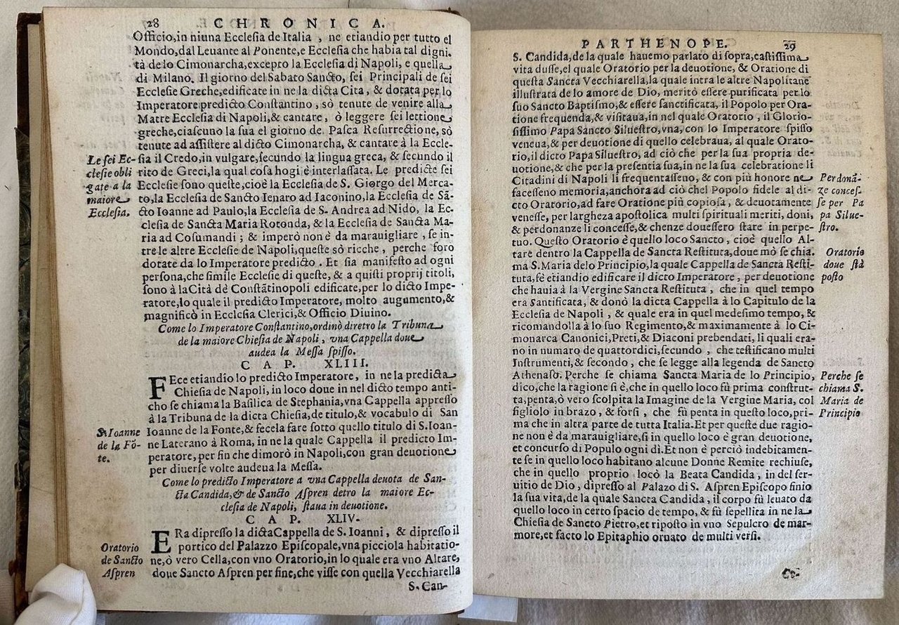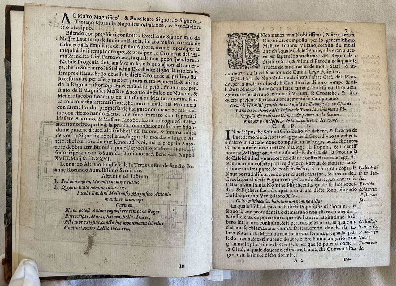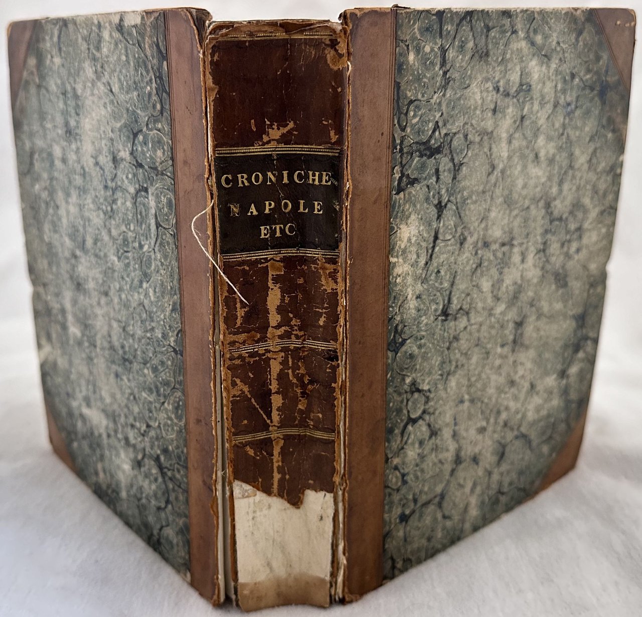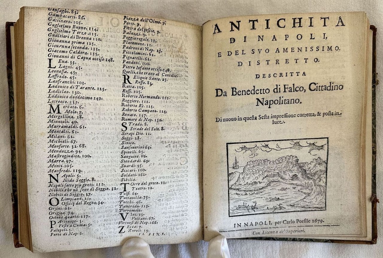 Edizione del 1680 di questa ristampa a cura di Carlo Porsile di tre celebri opere sulla città di Napoli quasi introvabili nelle loro edizioni originali. Il nostro esemplare risulta mancante del frontespizio e delle prime otto carte di dedica. La prima opera "Croniche de la inclita città de Napole" falsamente attribuita a Giovanni Villani venne originariamente pubblicata nel 1526. Racconta eventi storici della città dall'origine fino al 1343. La nostra copia reca l'emblema tipografico della Sirena non presente in tutte le copie. La seconda opera originariamente pubblicata nel 1569 a cura di Luigi Contarini, descrive le principali bellezze artistiche di Roma e Napoli. La terza opera descrive le principali antichità di Napoli. Scritta da Benedetto di Falco (1480-1540) venne originariamente pubblicata nel 1535. In buone condizioni. Copertina in mezza pelle ottocentesca con titolo in oro al dorso in mediocri condizioni generali con usure e mancanze ai margini e dorso. Piatto anteriore quasi staccato e posteriore staccato. Legatura in buone condizioni a parte le prime due pagine quasi staccate. All'interno le pagine si presentano in buone condizioni con rare fioriture. Frontespizio e prime otto pagine di dedica mancanti come anche pagina 9 dell'ultima opera. In 8. Dim. 19,5x15 cm. Pp. 120+(8)+92+(5)+170+(2)+64Edition of 1680 of this republishing edited by Carlo Porsile of three famous works about the city of Naples almost unfoundable even in that period. Our copy lacks of the title page and the first 8 page of dedication. The first work "Croniche de la inclita città de Napole" falsely attributed to Giovanni Villani was originally published inl 1526. He tells about hystorical events of the city from the origins to 1343. Our copy has the mark of mermaid at the end of the first work not present in al copies. The second work originally published in 1569 by Luigi Contarini, describes the artistic beauties of Rome and Naple The third work describes the main antiquities of Naples. It was written by Benedetto di Falco (1480-1540) and was originally published in 1535. In good conditions. Half leather cover of XIX century with gilted title in the spine in poor general conditions lightly worn in the extremities. Front palte almost detached and back plate detached. Binding in good conditions apart for the first two pages almost totally detached. Inside pages are in good conditions with occasional foxing. Title page and first eight pages of dedication missing as also page 9 of the last work. In 8. Dim. 19,5x15 cm. Pp. 120+(8)+92+(5)+170+(2)+64