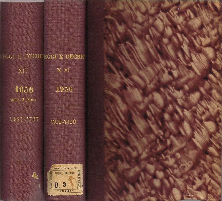 Anno 1956 incompleto, presenti: Volume Decimo - Il presente volume contiene i decreti dal numero 1109 al numero 1299, pubblicato nel 1956; Volume Undicesimo - Il presente volume contiene i decreti dal numero 1300 al numero 1456; Volume Dodicesimo - Il presente volume contiene i decreti dal numero 1457 al numero 1690; Volume Supplementare - Il presente volume contiene i decreti dal numero 1691 al numero 1737; Indici 1956, distribuiti in due tomi, del periodico Raccolta ufficiale delle Leggi e dei Decreti della Repubblica Italiana. Due volumi in stato discreto, coperta in mezzatela con angoli, piatti marmorizzati, sul dorso caratteri dorati in bassorilievo e talloncino in carta con catalogazione bibliotecaria, qualche segno d'uso, tagli e margini delle pagine leggermente ambrati, quello di testa di colore bordeaux, pagine in buono stato, prime e ultime un po' ambrate, Volume X-XI con macchiette sul taglio concavo; Volume XII-Supplementare e Indici con foglio di guardia con piega, gora su risguardie. Presentano talloncino in carta con catalogazione bibliotecaria su risguardia, appunti scritti a matita su occhiello, timbro ex biblioteca su occhiello e frontespizio del Volume X-XI e sul margine di piede di alcune pagine, timbro numerale ed ex biblioteca alla pagina successiva il frontespizio. Lingue: Italiano, Francese. Numero Pagine 1993, numerazione delle pagine in sequenza