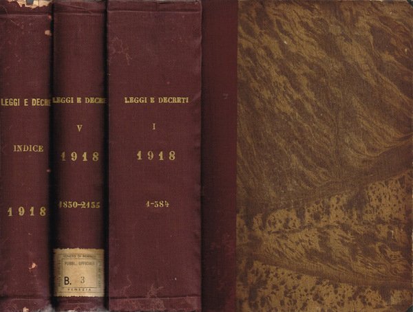 Anno 1918 incompleto, presenti: Volume Primo, dal n. 1 al n. 384; Volume Quinto, dal decreto Luogotenenziale 2 dicembre 1918, n. 1830 al decreto Luogotenenziale 27 ottobre 1918, n. 2135; Indice 1918, quest'ultimo di 284 pagine, della collana Raccolta ufficiale delle Leggi e dei Decreti del Regno d'Italia. Volume Primo e Indice 1918 stampati nel 1919. Tre volumi della seconda decade del '900 in stato discreto, coperta in mezzatela con angoli, piatti marmorizzati, sul dorso caratteri dorati in bassorilievo, Volume Quinto con talloncino in carta con catalogazione bibliotecaria, alcuni segni d'uso, fioritura sparsa, tagli ambrati, quello di piede del Volume Primo con poche barbe, tutti con taglio di testa di colore bordeaux, pagine in buono stato, alcune pagine e margini leggermente ambrati, presenza di gora; Volume Primo e Volume Quinto con appunti a matita su occhiello. Presentano: Volume V con talloncino in carta con catalogazione bibliotecaria su risguardia, timbro ex biblioteca su foglio di guardia, frontespizio e sul margine di piede di qualche pagina; Indice 1918 con catalogazione bibliotecaria e timbro ex biblioteca su frontespizio e su excipit. Lingue: Italiano, Francese. Numero Pagine 2838, numerazione delle pagine in sequenza, tranne Indice