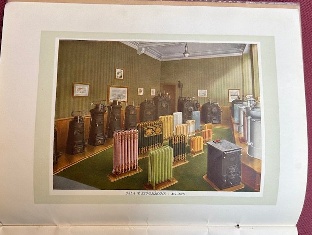 In 8, (18 x 23 cm), pp. 24, belle illustrazioni a colori anche a piena pagina, raffiguranti radiatori molto decorativi, sezioni di casa con intero impianto di riscaldamento, ville e palazzi riscaldati dai radiatori ideal e con le caldaie prodotte. Testo e illustrazioni entro riquadri monocromi, brossura editoriale illustrata con cordoncino.