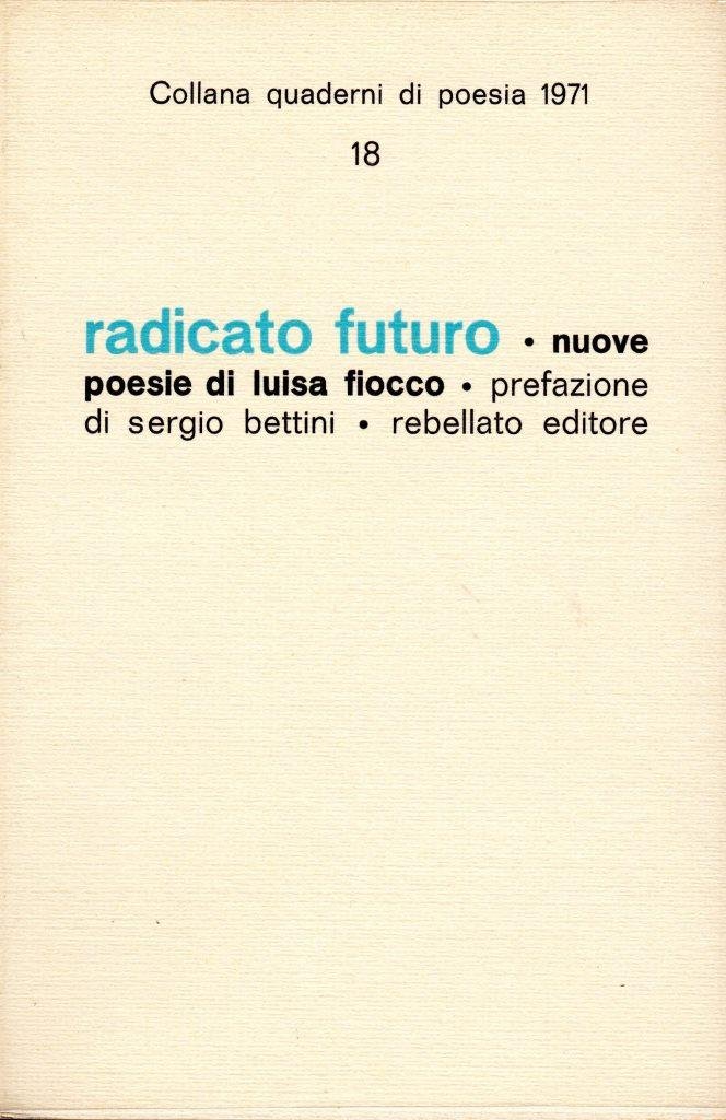 Radicato futuro, prima edizione 1971, pp. 66, formato 13 x 20.<BR>Copertina morbida di colore crema con titoli in nero e celeste al piatto anteriore e sul dorso. Presente sovraccoperta trasparente di protezione. Prefazione di Sergio Bettini. In prima pagina presente firma dell'autrice. <BR>Ottime condizioni.