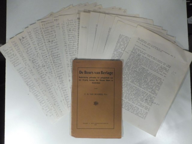 In 8 (cm 16 x 24,5), pp. 21 + (3b). Brossura editoriale. Insieme all'opuscolo originale compare la traduzione italiana stampata su 7 fogli sciolti curata da Irma Jacqueline Van Marie dal titolo 'Una conferenza radio in occasione del venticinquesimo anno di esistenza della Borsa Nuova di Amsterdam' (della traduzione italiana accludiamo anche la versione manoscritta su 15 fogli sciolti).