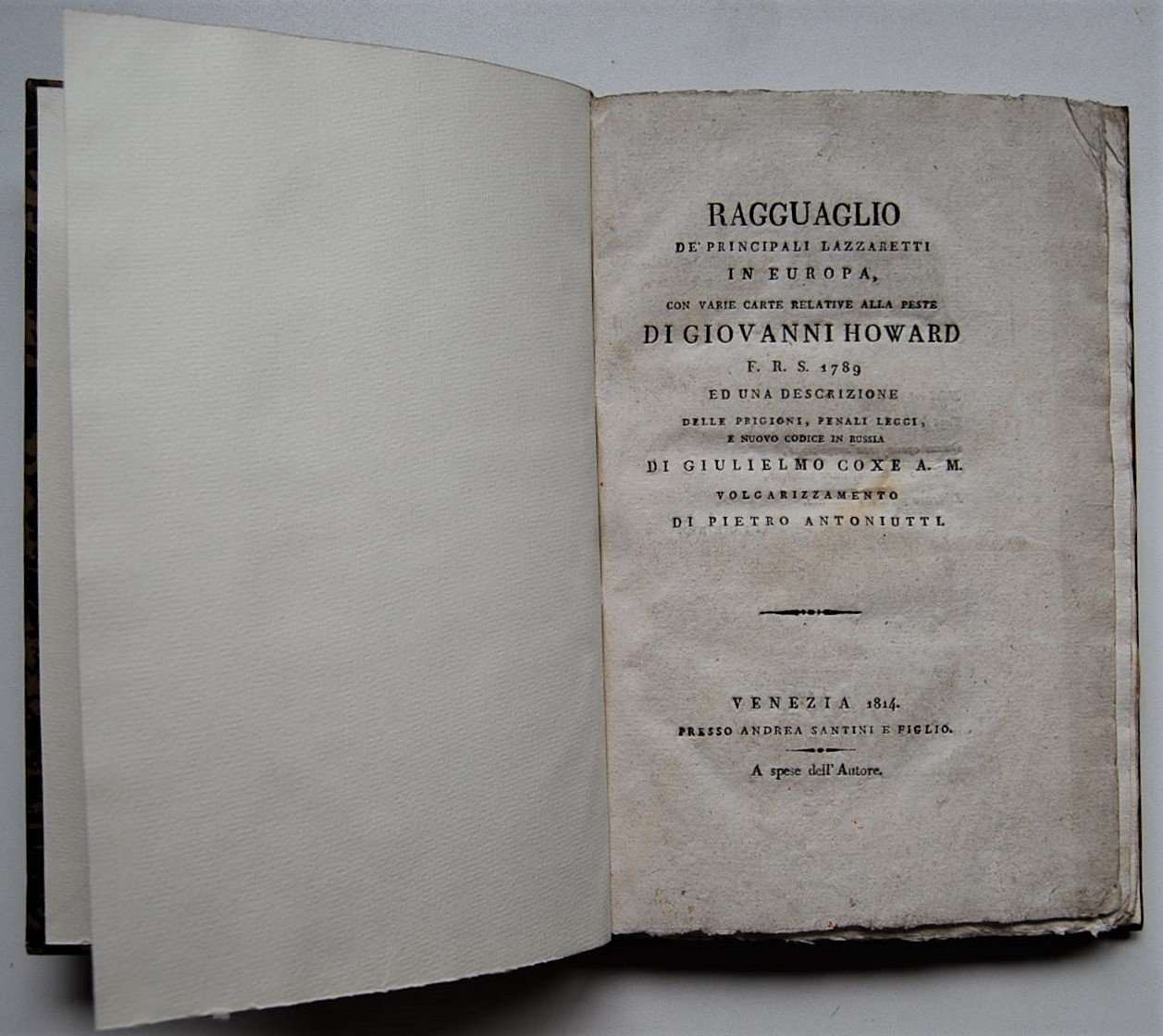 RAGGUAGLIO DE' PRINCIPALI LAZZARETTI IN EUROPA, CON VARIE CARTE RELATIVE ALLA PESTE DI GIOVANNI HOWARD F.R.S. 1789 ED UNA DESCRIZIONE DELLE PRIGIONI, PENALI LEGGI, E NUOVO CODICE IN RUSSIA DI GIULIELMO COXE A.M. VOLGARIZZAMENTO DI PIETRO ANTONIUTTI.