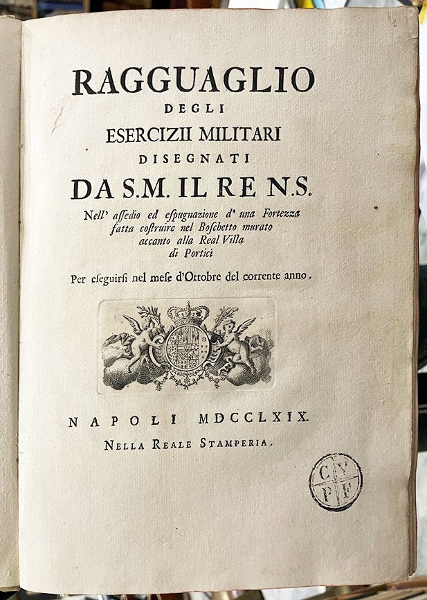 (Portici-Napoli-Borbonica-Fig. ’700) RAGGUAGLIO DEGLI ESERCIZI MILITARI disegnati da S. M. il Re nell’assedio ed espugnazione d’una Fortezza fatta costruire nel boschetto murato accanto alla Real Villa di Portici. Napoli, R. Stamperia, 1769. In-4°, leg. in t. perg. coeva con cornici e grande fleuron ai p. tit. in oro al dorso, pp. 45 compr. il front. con vign. incisa in rame raffig. lo stemma reale sorretto da putti e una grande tavola ripieg. f.t., incisa in rame da Filippo Morghen raffig. il Piano della fortezza ed assedio costruito nel boschetto della Villa di Portici.