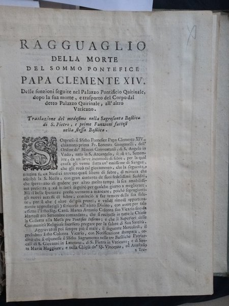 ragguaglio della morte del sommo pontefice papa clemente XIV delle funzioni seguite nel palazzo pontificio Quirinale . e trasporto del corpo dal detto Palazzo Quirinale all’altro Vaticano
