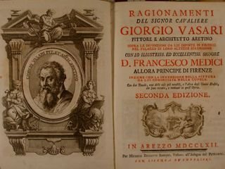 RAGIONAMENTI DEL SIGNOR CAVALIERE GIORGIO VASARI PITTORE E ARCHITETTO ARETINO SOPRA LE INVENZIONI DA LUI DIPINTE IN FIRENZE NEL PALAZZO DI LORO ALTEZZE SERENISSIME CON LO ILLUSTRISS. ED ECCELLENTE SIGNORE D. FRANCESCO MEDICI. Seconda Edizione. In Arezzo, Per Michele Bellotti. 1762.