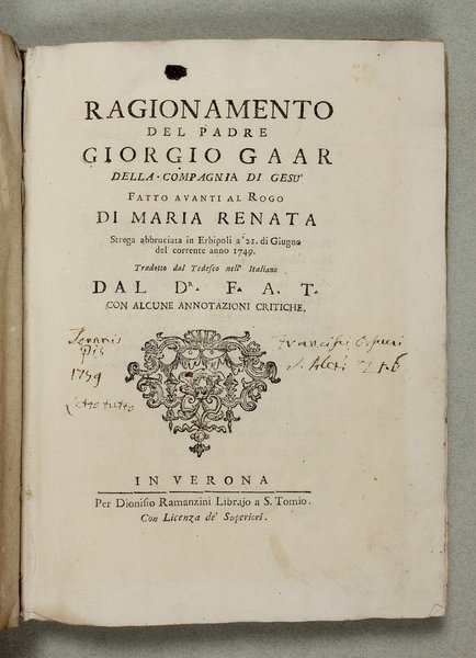 Ragionamento del padre Giorgio Gaar della Compagnia di Gesù fatto avanti al rogo di Maria Renata strega abbruciata in Erbipoli a' 21. di Giugno del corrente anno 1749. Verona, Dionisio Ramanzini, (1749). (Unito:) MAFFEI SCIPIONE. Arte magica dileguata lettera del signor marchese Maffei al padre Innocente Ansaldi dell'ordine de' predicatori. -Verona, per Agostino Carattoni, nella Via Nuova, 1750. (Unito:) MAFFEI SCIPIONE. Arte magica distrutta risposta di don Antonio Fiorio veronese arciprete di Tignale, e Valvestino, vicario foraneo. -Trento, per G.A. Brunati, 1750. (Unito:) LUGIATO ANDREA. Osservazioni sopra l'opuscolo che ha per titolo Arte magica dileguata, di un prete dell'oratorio. -Venezia, presso Simone Occhi, 1750.