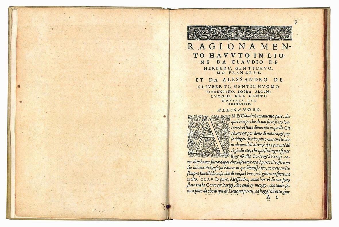 Ragionamento havuto in Lione, da Claudio de Herberé gentil'huomo franzese, et da Alessandro degli Uberti gentil'huomo fiorentino, sopra alcuni luoghi del Cento novelle di Boccaccio, i quali si ritroveranno secondo i numeri delle carte del Decamerone stampato in Lione, in picciola forma da G. Rovillo