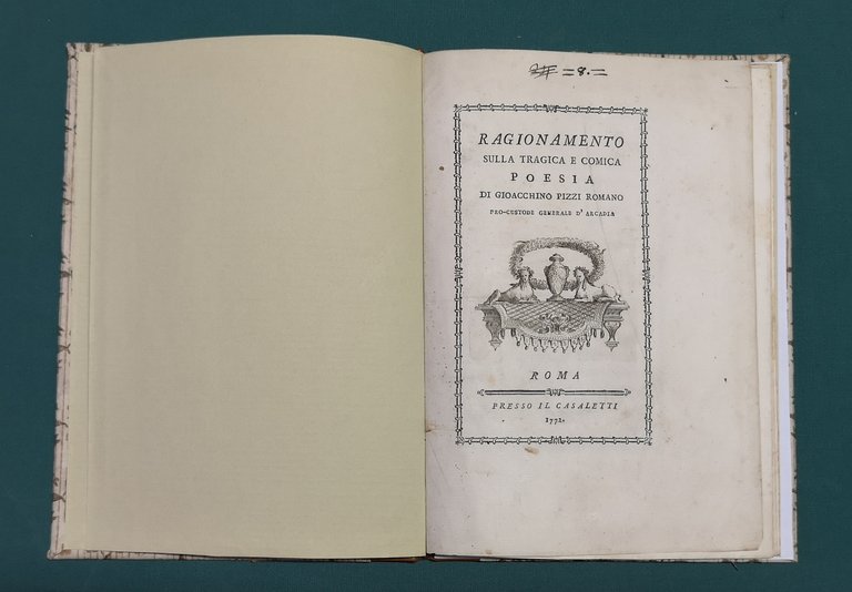 >in-8, pp. XXXII, elegante leg. mod. m. pelle, carta a fiori sui piatti. Vignetta al tit., testatina a pag. VII, ciasuna pagina in cornice silogr. Apologia del teatro italiano nei confronti di quello francese, letta dall'autore agli Arcadi romani. Opuscolo raro, dedicato al principe Niccola Colonna di Stigliano. Non riscontrato in alcun repertorio.