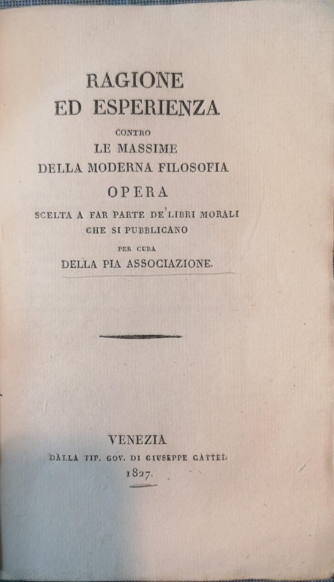 Ragione ed esperienza contro le massime della moderna filosofia opera scelta a far parte de' libri morali che si pubblicano per cura della Pia Associazione