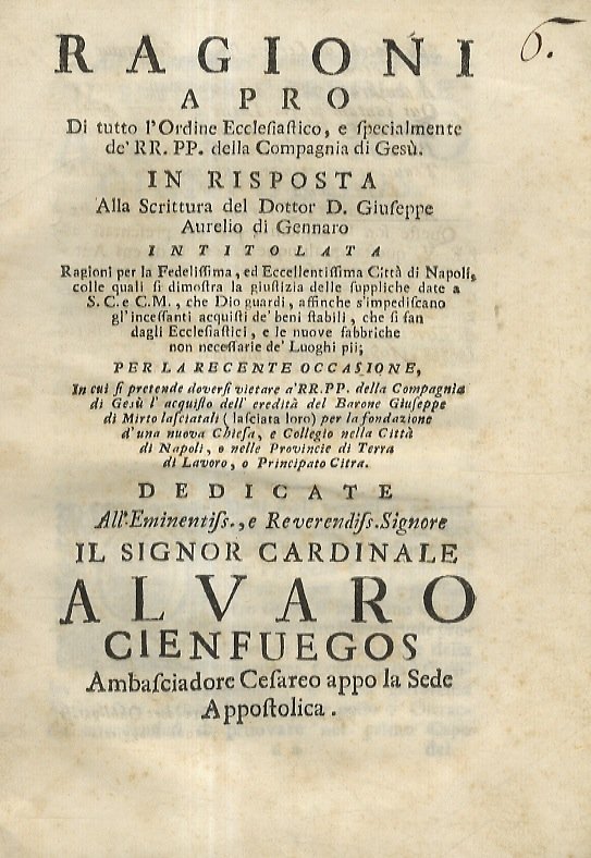 Ragioni a pro di tutto l'ordine ecclesiastico, e specialmente de' RR.PP. della Compagnia di Gesù. In risposta alla scrittura del dottor D. Giuseppe Aurelio di Gennario, intitolata ragioni per la fedelissima, ed eccellentissima citta di Napoli, colle quali si dimostra la giustizia delle suppliche date a S.C. e C.M. (.) per al recente occasione in cui si pretende doversi vietare a RR.PP. della Compagnia di Gesù l'acquisto dell'eredità del barone Giuseppe di Mirto (.)