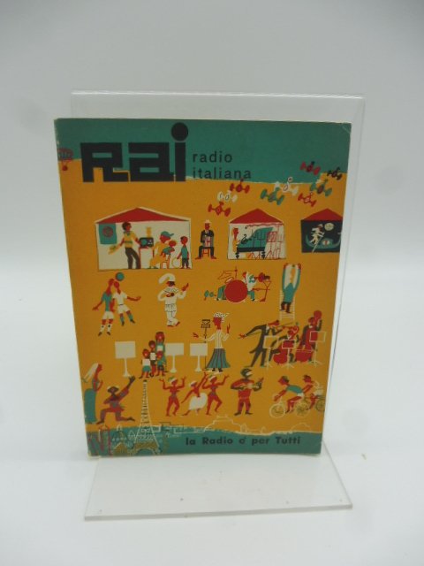 In 8 (cm 14 x 19), pp. 40 con illustrazioni intercalate al testo. Brossura editoriale illustrata. Libretto pubblicitario della Radio Rai con illustrazioni e impaginazione grafica di Fulvio Bianconi con notizie sui programmi radiofonici musicali e non solo. Fulvio Bianconi - scrive Orio Vergani - fu un disegnatore "compulsivo": "disegna in treno, in bicicletta, appoggiato al lampione; disegna in taxi, in gondola e in acqua con il salvagente.". Fulvio Bianconi e' stato un designer e grafico, noto in particolare per i suoi disegni sui vetri d'arte di Murano.