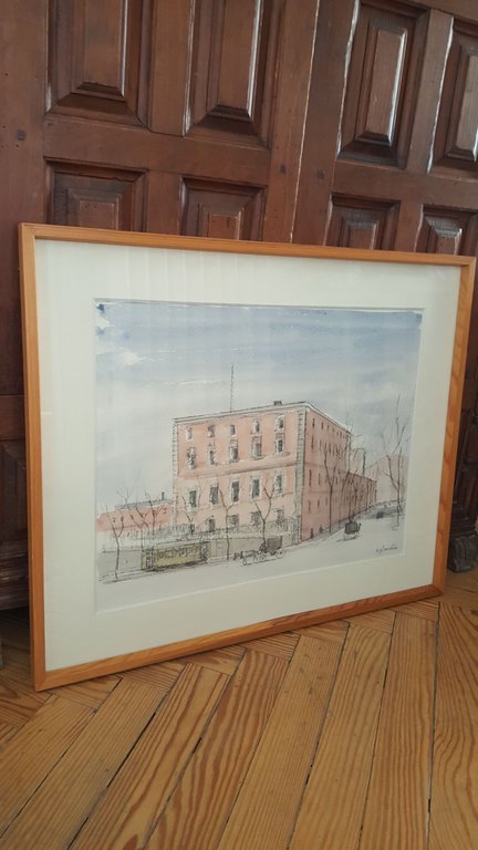 [Madrid], [ca. 1970].- Acuarela apaisada que lleva la firma en el ángulo inferior derecho; 57 x 44 cm (la acuarela en sí misma) y enmarcada en madera bajo cristal con medidas totales de 74,5 x 61,5 cm.- Representa la antigua Fábrica de Tabacos de la calle Embajadores en la cuidad de Madrid, formando parte del estilo paisajístico urbano que más caracterizó la trayectoria temática del artista.* Juan Esplandiú (Madrid 1901 - Madrid 1978) fue un pintor especializado en la acuarela, dibujo, ilustración y paisaje, perteneciente a la escuela de "pintores madrileñistas" que integraron el grupo de "El Paular". MADRID