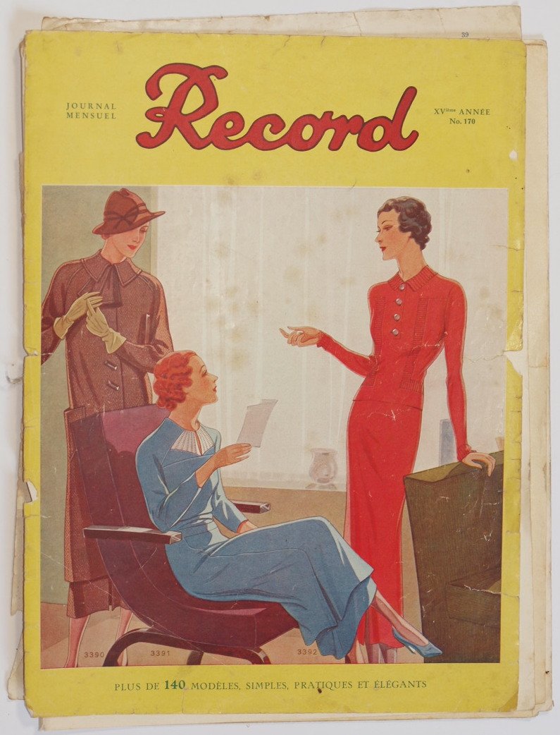 In 4. Dim. 32,5x24,5 cm. Pp. 31. Numero senza data ma del 1940 circa di questa rivista francese di moda "Record". All'interno modelli di abiti di alta classe per ogni occasione (dal n. 3393 al n. 3538 per un totale di 146 modelli, dei quali qualcuno colorato): pomeriggio, sera, eleganti, vestiti invernali pellicce, da ragazze e da bambine, bambini, abiti da sposa, per gli sport invernali con le misure per un maglione. Brossura editoriale originale. Bella illustrazione in copertina. In discrete condizioni. Brossura editoriale in discrete condizioni generali con usure e parti mancanti ai margini e dorso. Piatti staccati. Legatura quasi assente. Pagine in discrete condizioni con rare fioriture e qualche strappo. Not dated number but of 1920 of this french magazine of fashion "Record". Inside of models of high class garments from n. 3393 to n. 3538 fpr a total of 146 models, of which some are coloured): evening, day, elegants, winter garments, girls and children, bride dresses, for winter sports with the sizes to do a pullover. Beautiful illlustration in the cover. In fair conditions Editorial cover in fair general conditions with wearings and missing parts in the edges and spine. Foxings. Plates detached. Binding in fair conditions with some page detached. Pages are in fair conditions with occasional foxings and some tears.
