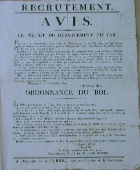 A Draguignan, chez Fabre imprimeur, 1820. 38 x 31 cm. Document en bon état. Avis ayant pour objet le départ de la classe de 1818.
