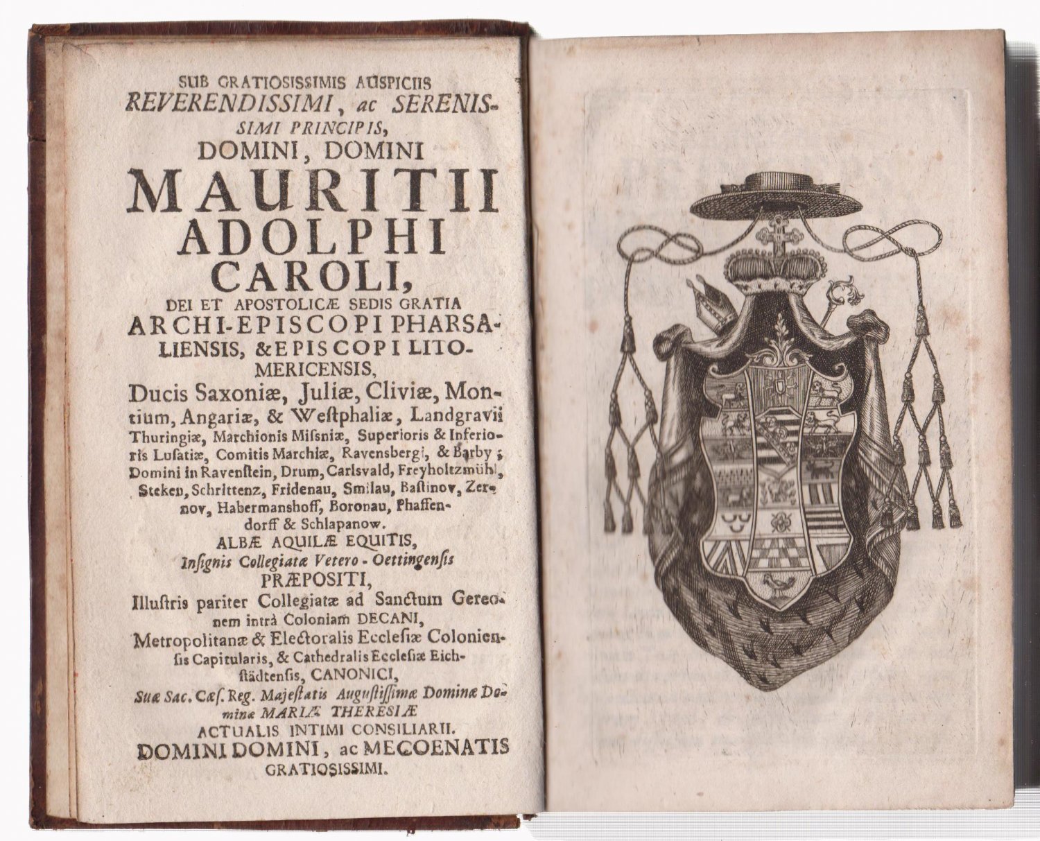 Seltenes Buch in lateinisches Sprache mit 2 Stichen: 1 ganzseitiges Kupfer eines Wappen und eine halbseitige Schlußvignette auf S. 2 / Rare book of 1748 with two engravings. Text in Latin.