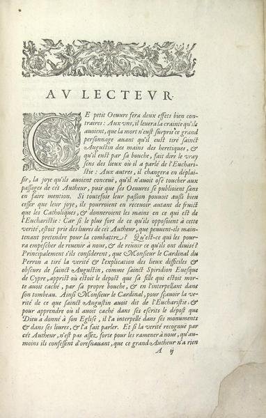 A Paris, par Antoine Estienne, 1624. In-folio (35 x 22 cm) reliure plein veau sombre du temps, dos restauré en basane brune à nerfs décoré de filets, fleurons et titres dorés, double filets sur les plats, 4 f., 231 p., 12 f. n. ch. (table). Trois feuillets avec des restaurations anciennes ; large auréole sur 2 feuillets et petite auréole en marge sur 2 feuillets. Antoine Estienne (Genève 1594 - Paris 1674) fils de Paul, imprimeur Français, dernier imprimeur d'une lignée qui en compta cinq (dont le plus célèbre - Robert Estienne son arrière-grand-père - qui fut également humaniste). Antoine poursuit des études à Lyon, avant de se rendre à Paris à l'âge de dix-huit ans. Il embrasse la religion catholique et obtient en 1614 le titre d'imprimeur du roi et du clergé. Le cardinal Du Perron, son protecteur, lui fait accorder une pension de 500 livres qu'il cesse de percevoir dès la mort du prélat. Il réimprime pour la société des libraires de Paris les Pères grecs, et publie d'autres ouvrages importants, tels que la Bible de Morin, l'Aristote de Duval, Strabon, Xénophon, Plutarque, etc. Antoine, devenu infirme et aveugle, se voit obligé de solliciter une place à l'Hôtel-Dieu de Paris, où il meurt en 1674, à l'âge de 80 ans. Le présent ouvrage présente en page de titre la fameuse marque d'imprimeur de son arrière grand-père (homme sous un olivier portant la devise "Noli altum sapere"). Robert, fut contrait de s'exiler à Genève pour ses convictions religieuses, mal considérées par la Sorbonne. Son arrière petit-fils se converti lui au catholicisme et imprima des textes de propagande catholique comme le présent ouvrage.