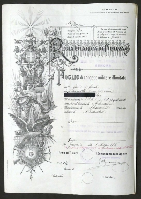 Regia Guardia di Finanza - Foglio di Congedo Militare Illimitato - Mandamento di Alessandria - Datato: Genova, 15 dicembre 1926 Dimensioni: 24 x 33 cm ca. Lingua italiana. Buone condizioni generali.