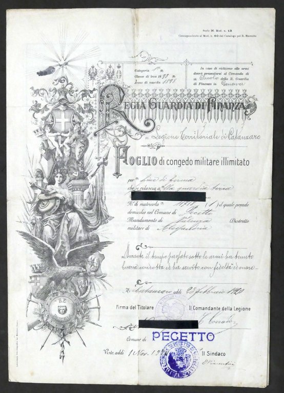 Regia Guardia di Finanza - Foglio di Congedo Militare illimitato - Pecetto 1920