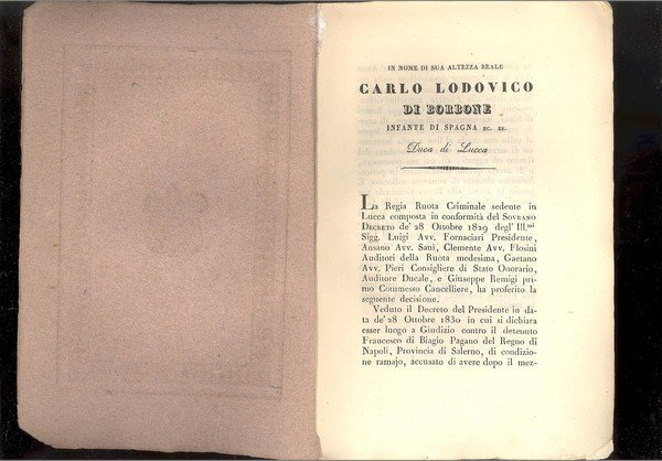 IN 8° ( cm.22 X 14,5 ), pp.103.COPERTINA EDITORIALE IN BROSSURA MARRONE CON CORNICE<BR>E STEMMA AL CENTRO.E' LA SENTENZA EMESSA DAL CONSIGLIERE DI STATO ONORARIO AUDITORE LOCALE AGLI ILLUSTRISSIMI SIGNORI PRESIDENTE, E GIUDICI DELLA REGIA<BR>RUOTA CRIMINALE,REGNANDO CARLO LODOVICO DI BORBONE DUCA DI LUCCA.<BR>OTTIMA CONSERVAZIONEID 1168